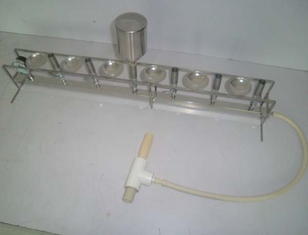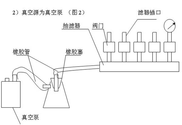 將濾器接桿上的橡膠塞,插入不銹鋼底座,濾器的多小孔平面上裝上浸泡的濾膜,放上不銹鋼濾器倒入水樣至相應刻線,便可進行抽濾。